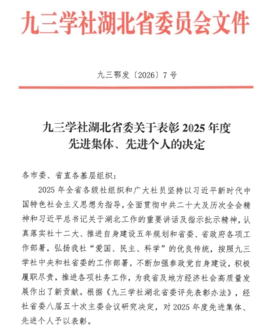 近日,九三学社湖北省委员会对全省2025年度在各项社务工作中表现突出的先进集体和先进个人进行了表彰。其中,九三学社武汉学院支社荣获“信息工作进步集体”称号,支社委员董秋敏凭借扎实的工作表现和突出的工作成效,获评“优秀信息员”。